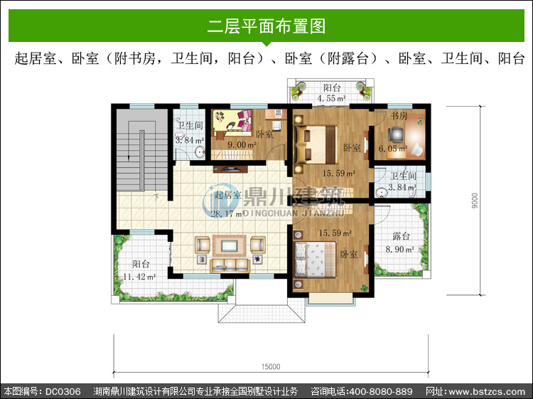 | 二 層: | 起居室、臥室(附書房,衛(wèi)生間,陽臺)、臥室(附露臺)、臥室、衛(wèi)生間、陽臺 | |||