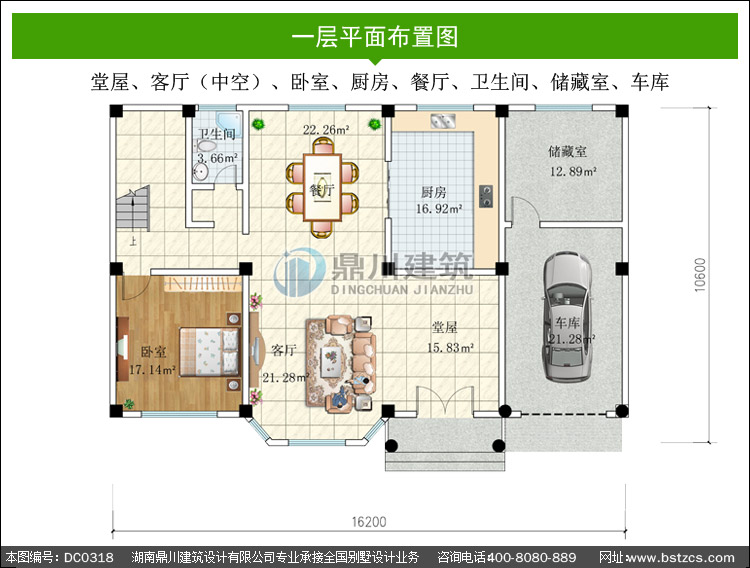 | 一 層: | 堂屋、客廳(中空)、臥室、廚房、餐廳、衛(wèi)生間、儲藏室、車庫 | |||