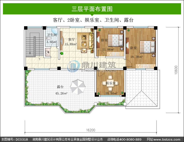 | 三 層: | 客廳、2臥室、娛樂室、衛(wèi)生間、露臺 | |||