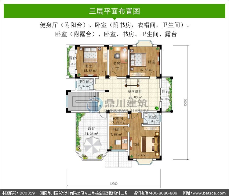 | 三 層: | 健身廳(附陽臺)、臥室(附書房,衣帽間,衛生間)、臥室(附露臺)、臥室、書房、衛生間、露臺 | |||