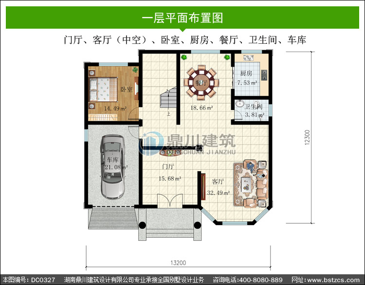 | 一 層: | 門廳、客廳(中空)、臥室、廚房、餐廳、衛生間、車庫 | |||