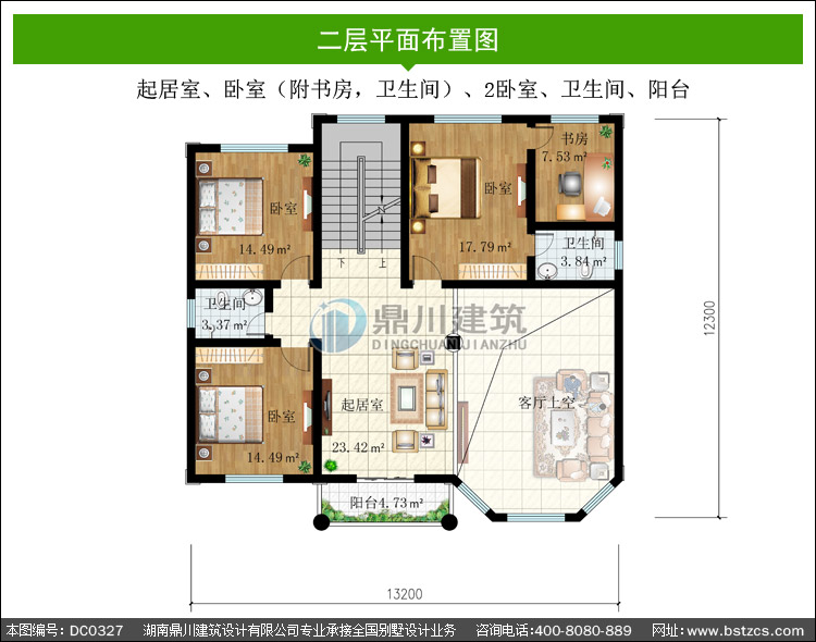 | 二 層: | 起居室、臥室(附書房,衛生間)、2臥室、衛生間、陽臺 | |||