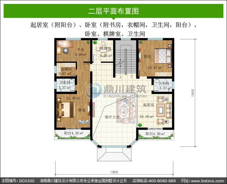 | 二 層: | 起居室(附陽臺(tái))、臥室(附書房,衣帽間,衛(wèi)生間,陽臺(tái))、臥室、棋牌室、衛(wèi)生間 | |||