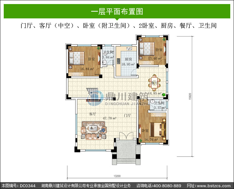 | 一 層: | 門廳、客廳(中空)、臥室(附衛生間)、2臥室、廚房、餐廳、衛生間 | |||