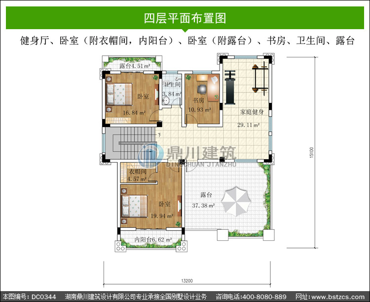 | 四 層: | 健身廳、臥室(附衣帽間,內陽臺)、臥室(附露臺)、書房、衛生間、露臺 | |||
