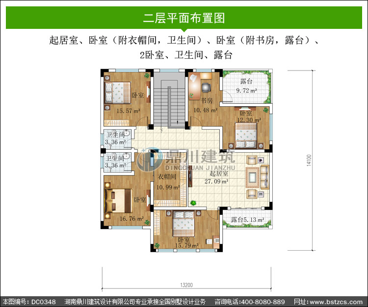 | 二 層: | 起居室、臥室(附衣帽間,衛生間)、臥室(附書房,露臺)、2臥室、衛生間、露臺 | |||