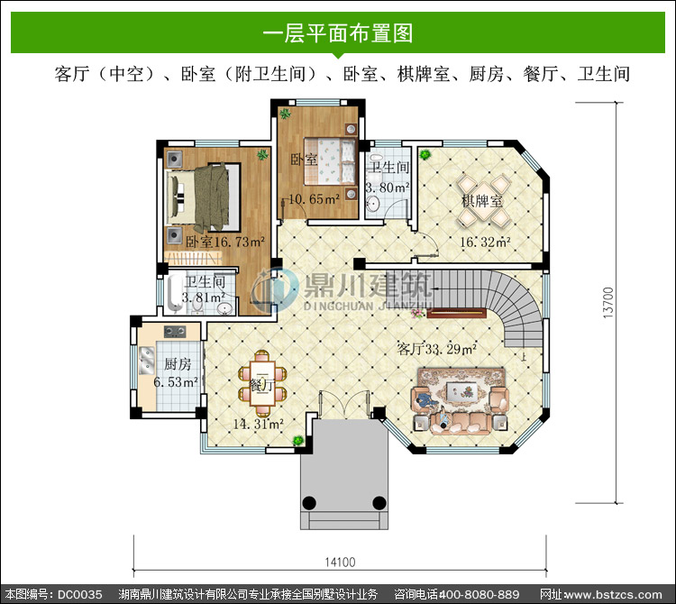 | 一 層: | 客廳(中空)、臥室(附衛(wèi)生間)、臥室、棋牌室、廚房、餐廳、衛(wèi)生間 | |||