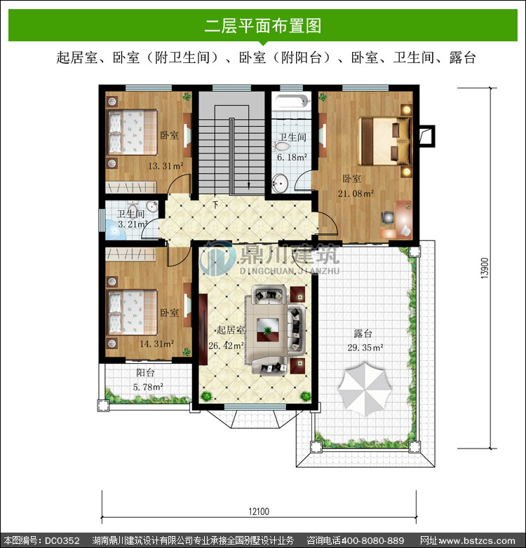 | 二 層: | 起居室、臥室(附衛(wèi)生間)、臥室(附陽臺)、臥室、衛(wèi)生間、露臺 | |||