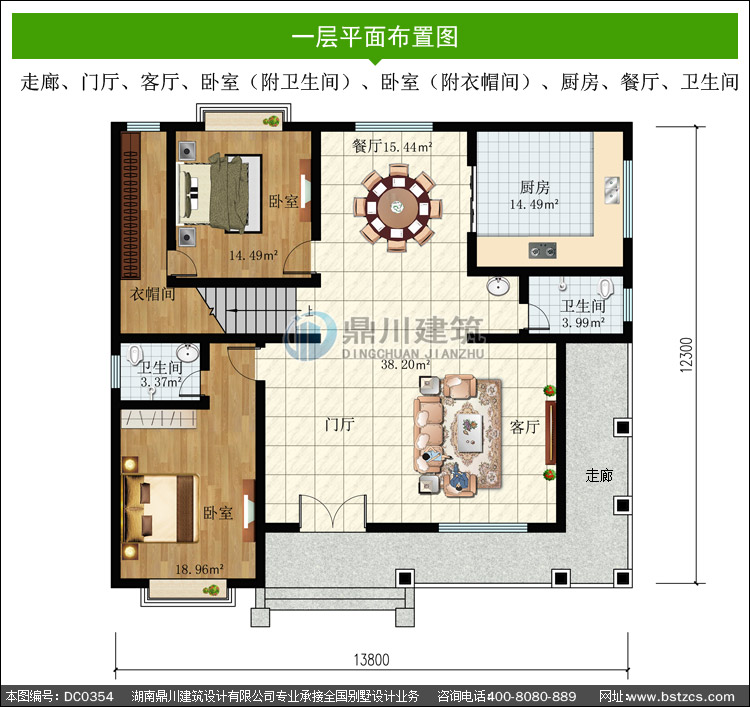 | 一 層: | 走廊、門廳、客廳、臥室(附衛生間)、臥室(附衣帽間)、廚房、餐廳、衛生間 | |||
