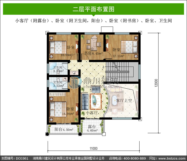 | 二 層: | 客廳(附露臺)、臥室(附衛生間,陽臺)、臥室(附書房)、臥室、衛生間 | |||