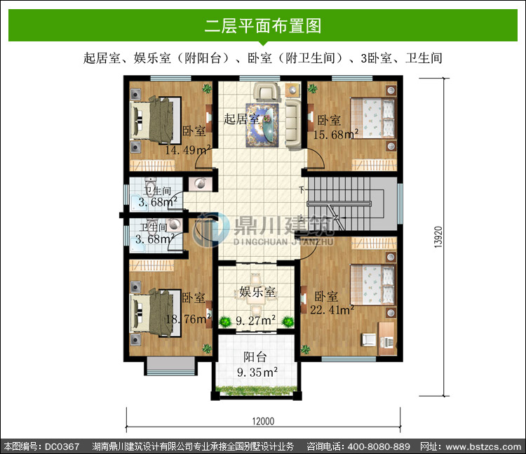 | 二 層: | 起居室、娛樂室(附陽臺)、臥室(附衛生間)、3臥室、衛生間 | |||