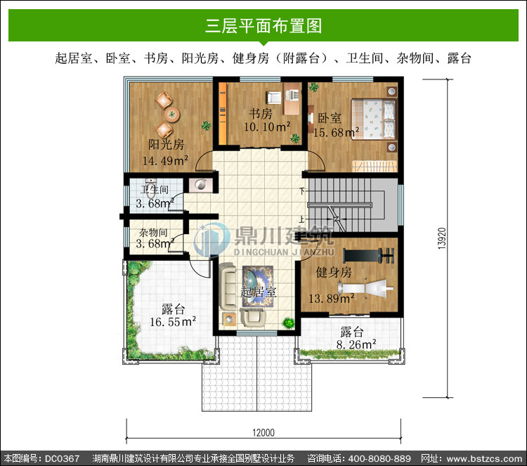 | 三 層: | 起居室、臥室、書房、陽光房、健身房(附露臺)、衛生間、雜物間、露臺 | |||