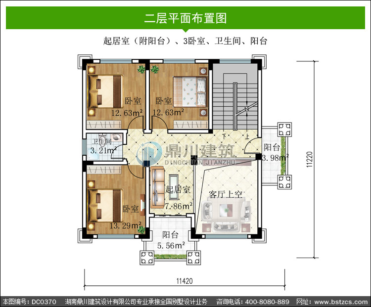 | 二 層: | 起居室(附陽臺)、3臥室、衛生間、陽臺 | |||