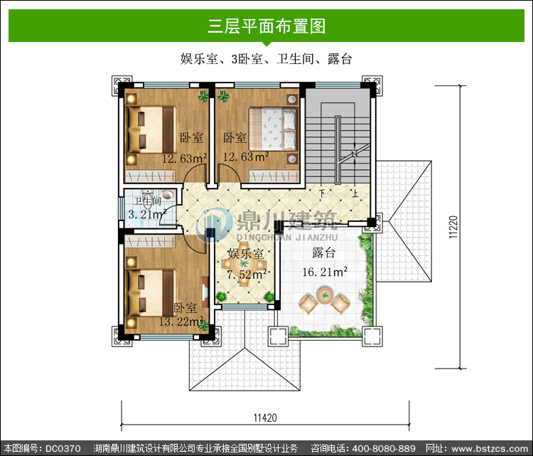 | 三 層: | 娛樂室、3臥室、衛生間、露臺 | |||