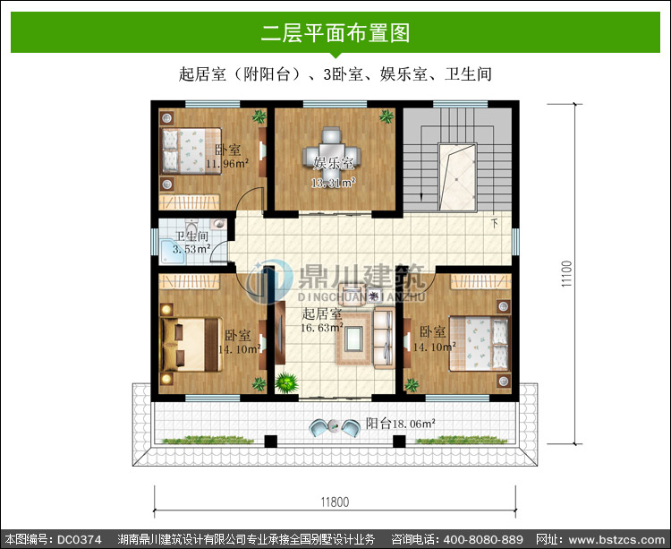 | 二 層: | 起居室(附陽臺)、3臥室、娛樂室、衛生間 | |||