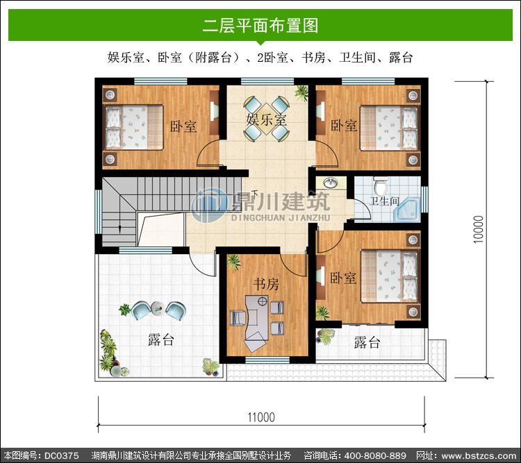 | 二 層: | 娛樂室、臥室(附露臺)、2臥室、書房、衛生間、露臺 | |||