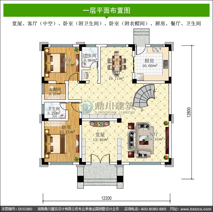 | 一 層: | 堂屋、客廳(中空)、臥室(附衛(wèi)生間)、臥室(附衣帽間)、廚房、餐廳、衛(wèi)生間 | |||