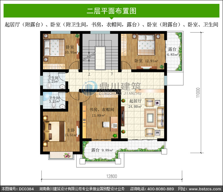 | 二 層: | 起居廳(附露臺)、臥室(附衛生間,書房,衣帽間,露臺)、臥室(附露臺)、臥室、衛生間 | |||