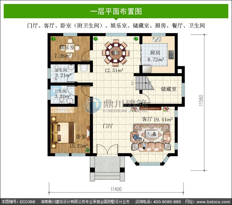 | 一 層: | 門廳、客廳、臥室(附衛生間)、娛樂室、儲藏室、廚房、餐廳、衛生間 | |||