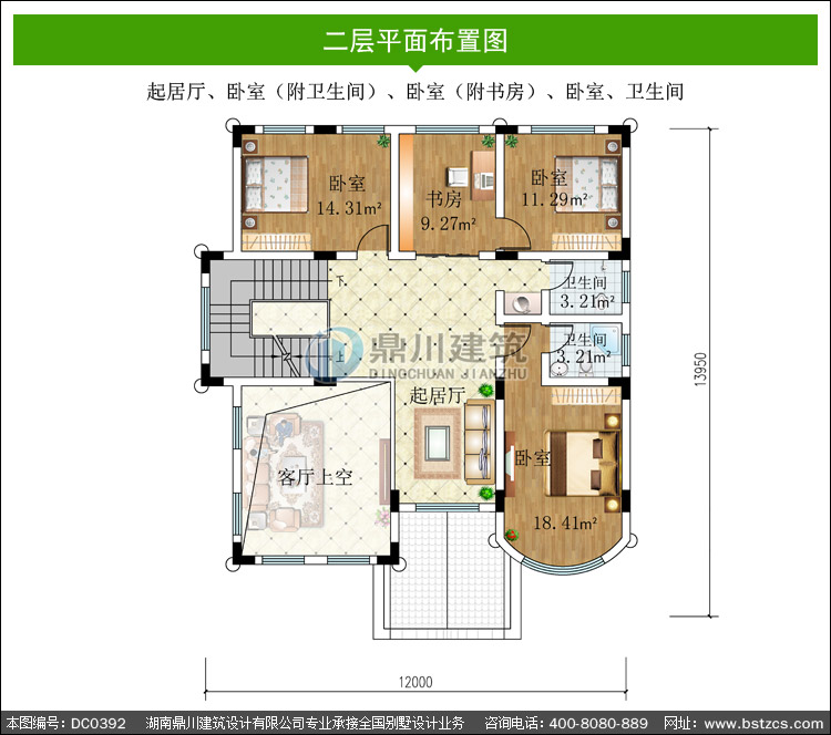 | 二 層: | 起居廳、臥室(附衛生間)、臥室(附書房)、臥室、衛生間 | |||