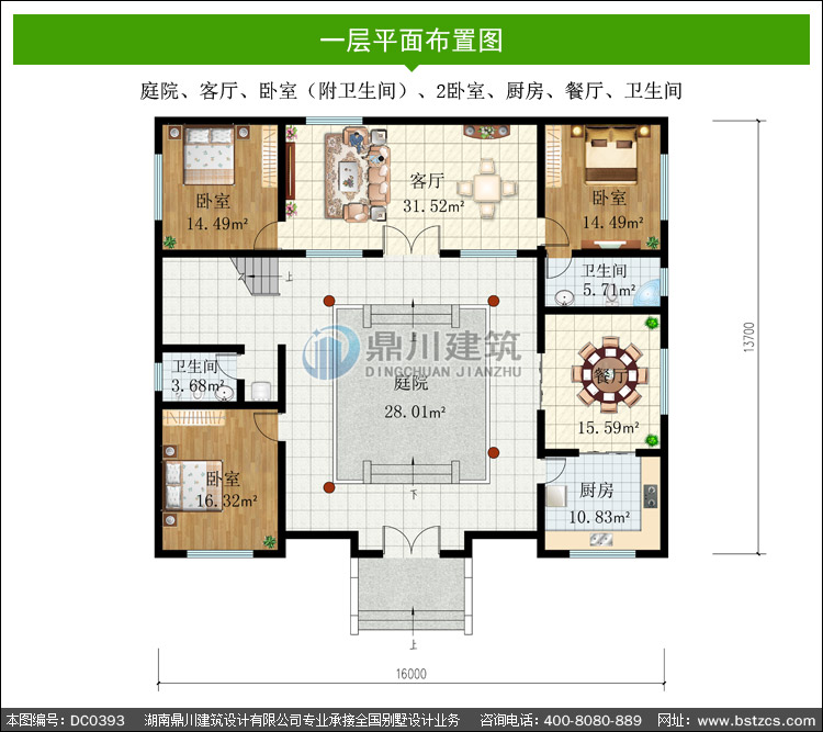 | 一 層: | 庭院、客廳、臥室(附衛(wèi)生間)、2臥室、廚房、餐廳、衛(wèi)生間 | |||