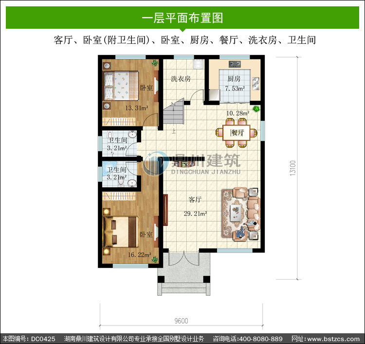 | 一 層: | 客廳、臥室(附衛生間)、臥室、廚房、餐廳、洗衣房、衛生間 | |||