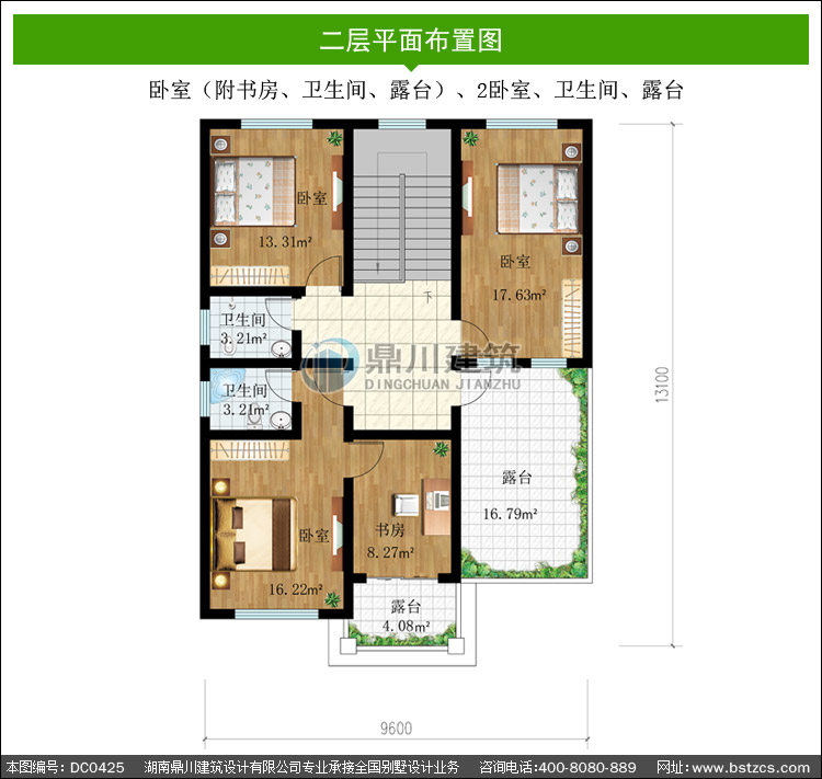 | 二 層: | 臥室(附書房、衛生間、露臺)、2臥室、衛生間、露臺 | |||