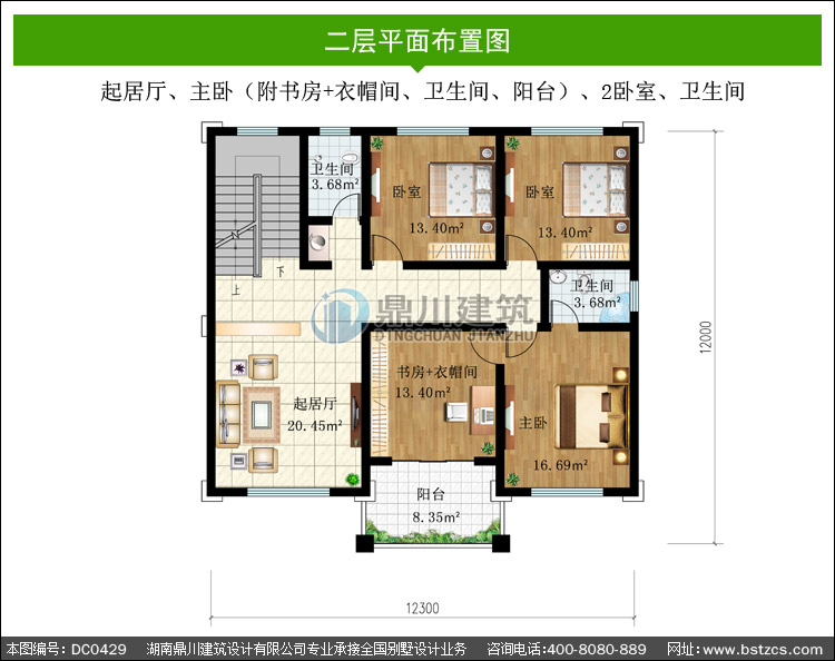 | 二 層: | 起居廳、主臥(附書房+衣帽間、衛生間、陽臺)、2臥室、衛生間 | |||