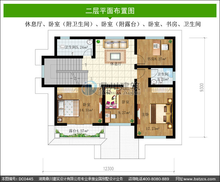 | 二 層: | 休息廳、臥室(附衛生間)、臥室(附露臺)、臥室、書房 、衛生間 | |||