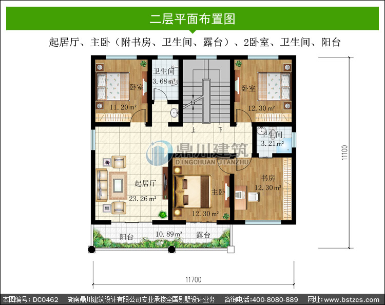 | 二 層: | 起居廳、主臥(附書房、衛(wèi)生間、露臺(tái))、2臥室、衛(wèi)生間、陽(yáng)臺(tái) | |||