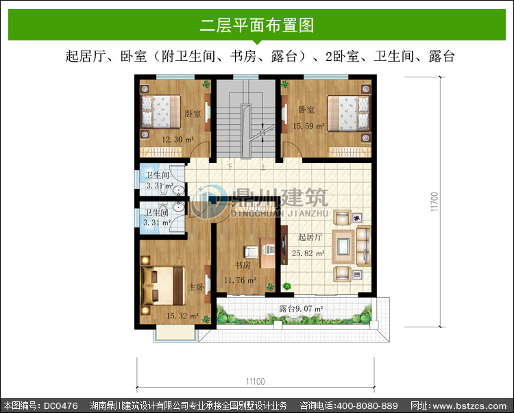 | 二 層: | 起居廳、臥室(附衛生間、書房、露臺)、2臥室、衛生間、露臺 | |||