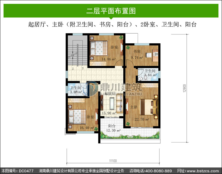 | 二 層: | 起居廳、主臥(附衛生間、書房、陽臺)、2臥室、衛生間、陽臺 | |||