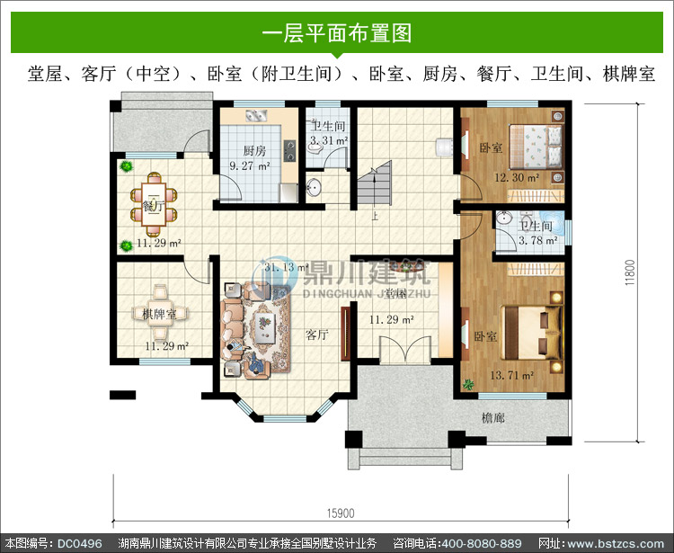 | 一 層: | 堂屋、客廳(中空)、臥室(附衛(wèi)生間)、臥室、廚房、餐廳、衛(wèi)生間、棋牌室 | |||