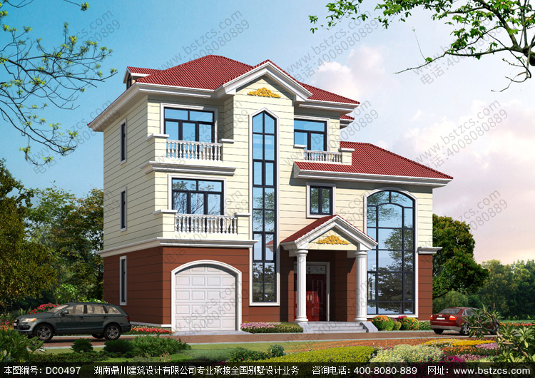 復式三層帶車庫歐式別墅外觀效果圖及施工圖設計_農村三層別墅設