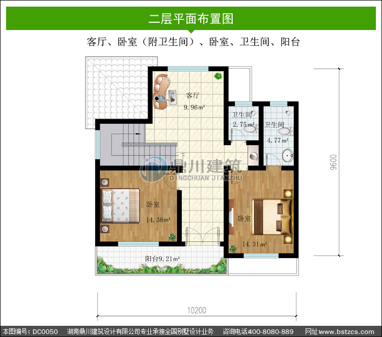 | 二 層: | 客廳、臥室(附衛生間)、臥室、衛生間、陽臺 | |||