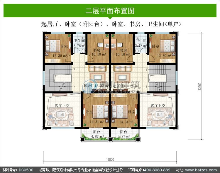 | 二 層: | 起居廳、臥室(附陽臺)、臥室、書房、衛生間 | |||