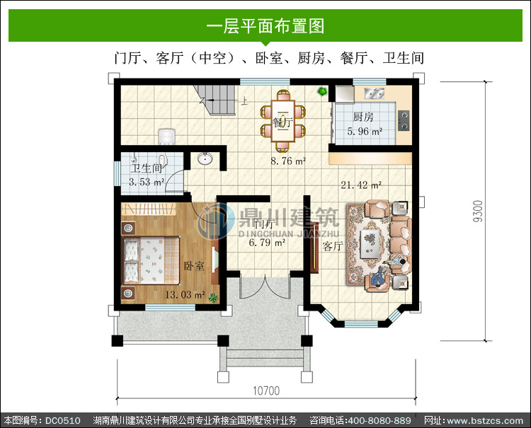 | 一 層: | 門廳、客廳(中空)、臥室、廚房、餐廳、衛生間 | |||
