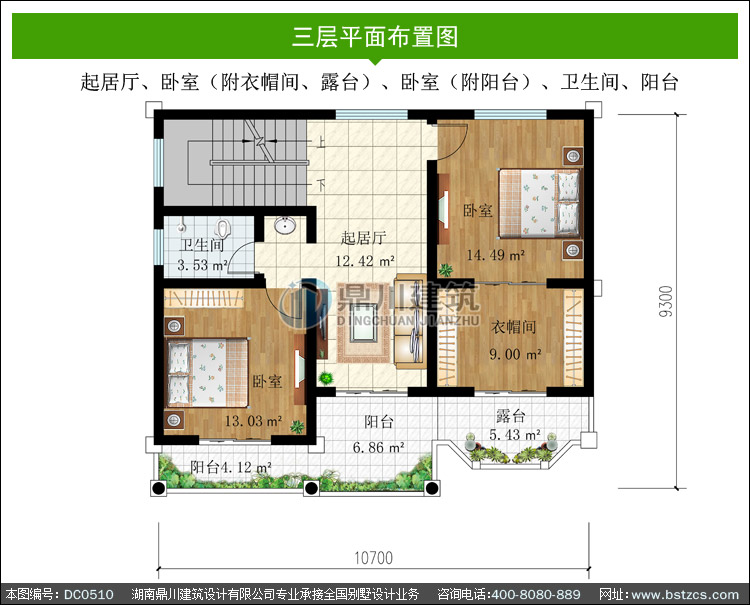 | 三 層: | 起居廳、臥室(附衣帽間、露臺)、臥室(附陽臺)、衛生間、陽臺 | |||