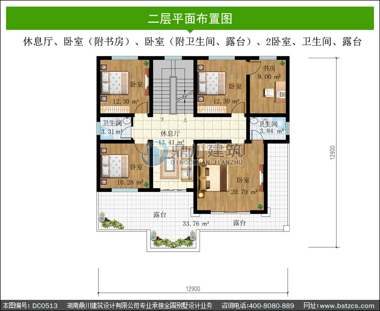 | 二 層: | 休息廳、臥室(附書房)、臥室(附衛生間、露臺)、2臥室、衛生間、露臺 | |||