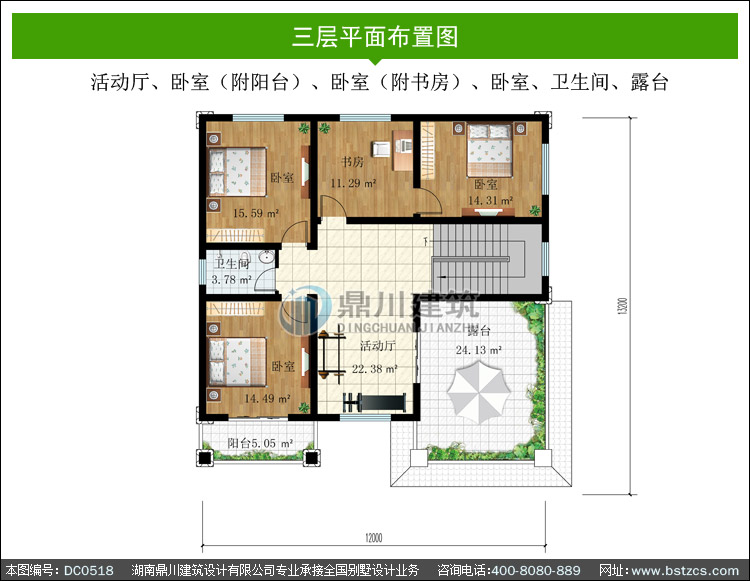 | 三 層: | 活動(dòng)廳、臥室(附陽臺(tái))、臥室(附書房)、臥室、衛(wèi)生間、露臺(tái) | |||