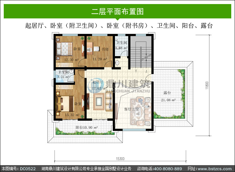 | 二 層: | 起居廳、臥室(附衛生間)、臥室(附書房)、衛生間、陽臺、露臺 | |||