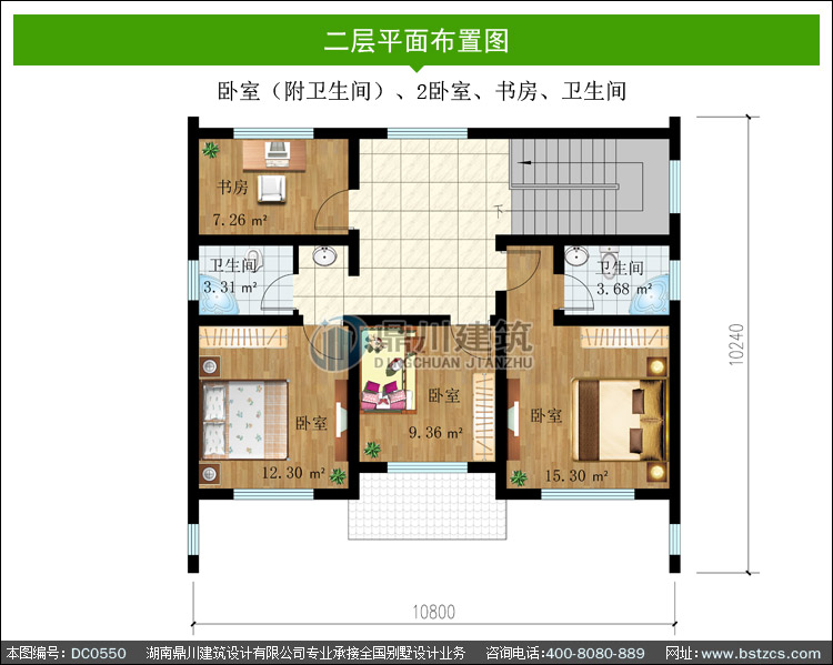 | 二 層: | 臥室(附衛生間)、2臥室、書房、衛生間 | |||