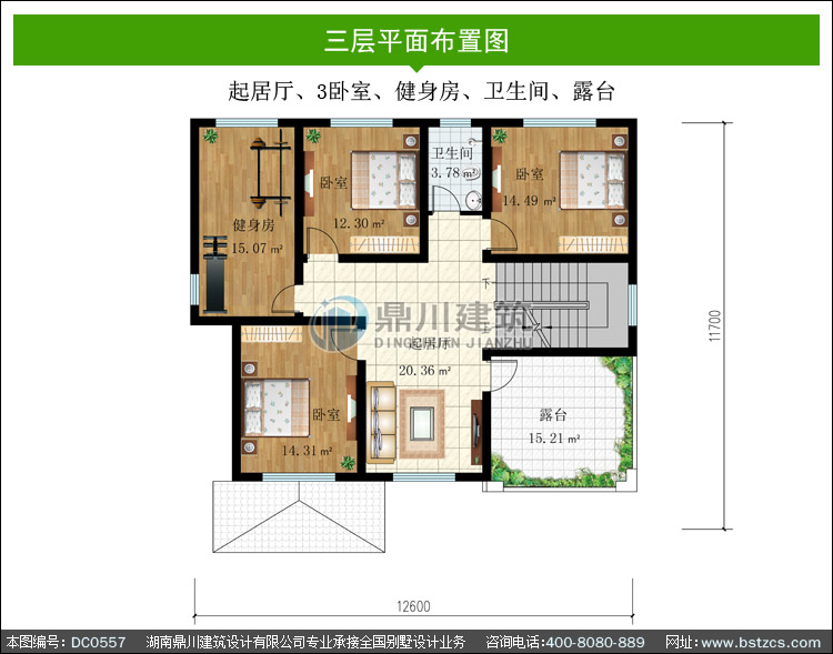 | 三 層: | 起居廳、3臥室、健身房、衛生間、露臺 | |||