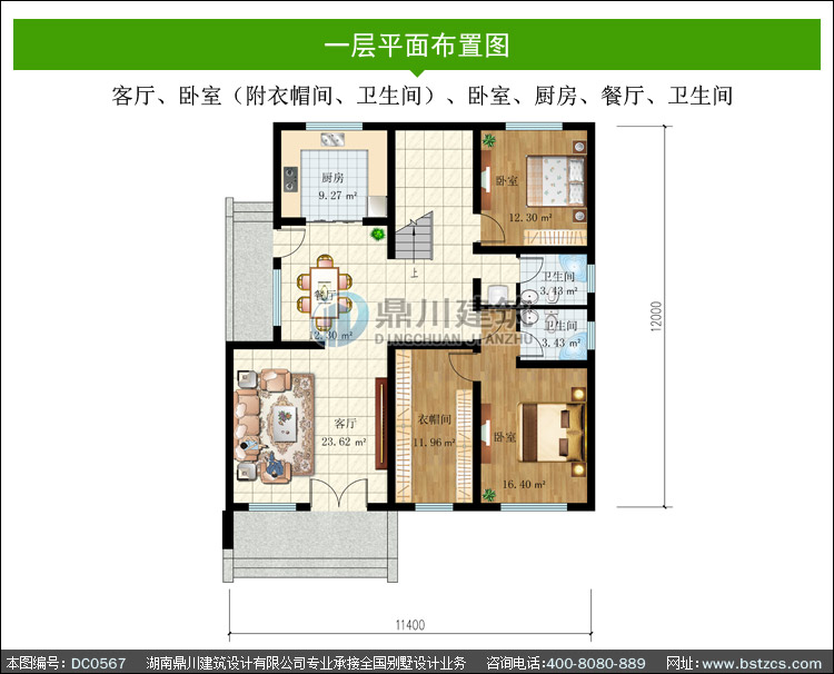 | 一 層: | 客廳、臥室(附衣帽間、衛生間)、臥室、廚房、餐廳、衛生間 | |||