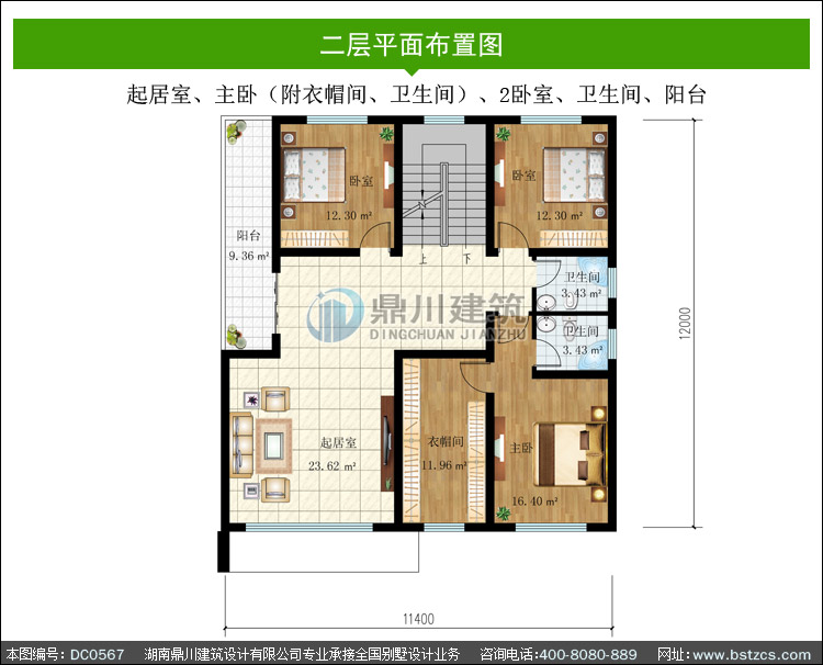 | 二 層: | 起居室、主臥(附衣帽間、衛生間)、2臥室、衛生間、陽臺 | |||