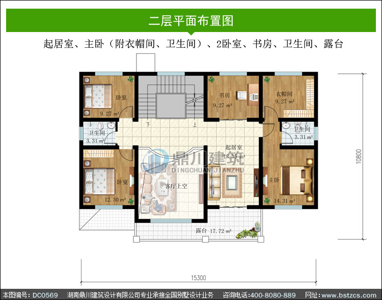 | 二 層: | 起居室、主臥(附衣帽間、衛生間)、2臥室、書房、衛生間、露臺 | |||