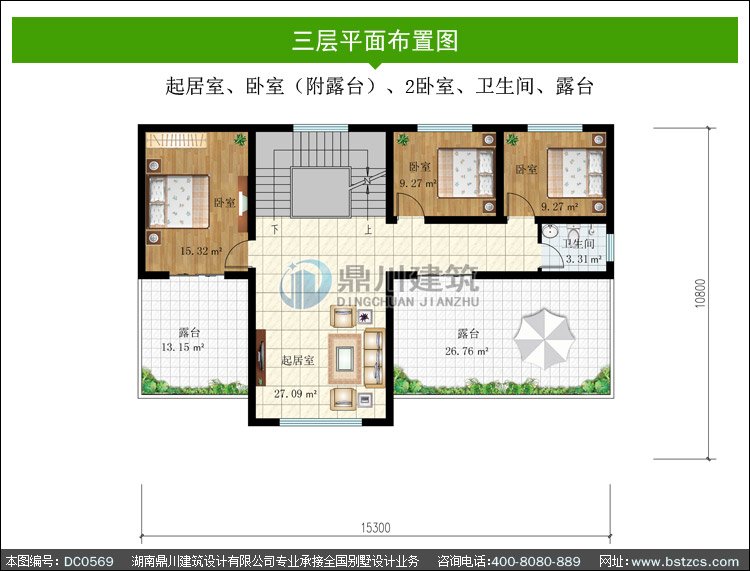 | 三 層: | 起居室、臥室(附露臺)、2臥室、衛生間、露臺 | |||