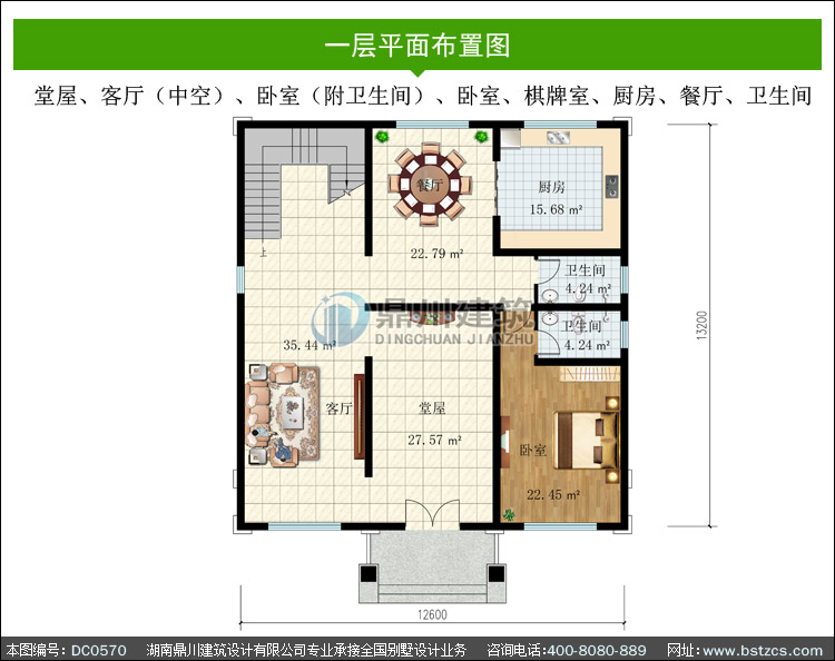 | 一 層: | 堂屋、客廳(中空)、臥室(附衛生間)、廚房、餐廳、衛生間 | |||