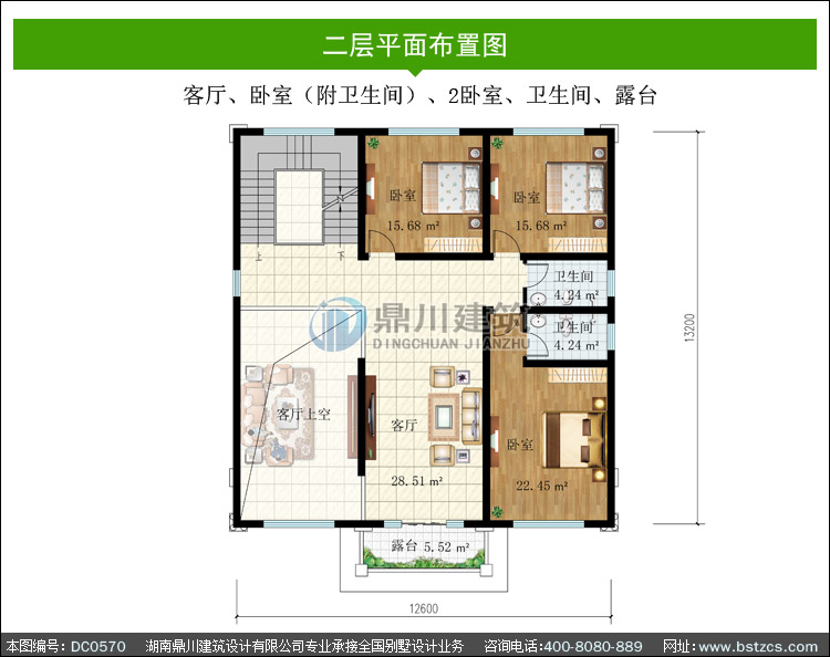 | 二 層: | 客廳、臥室(附衛生間)、2臥室、衛生間、露臺 | |||