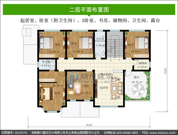 | 二 層: | 起居室、臥室(附衛生間)、3臥室、書房、儲物間、衛生間、露臺 | |||